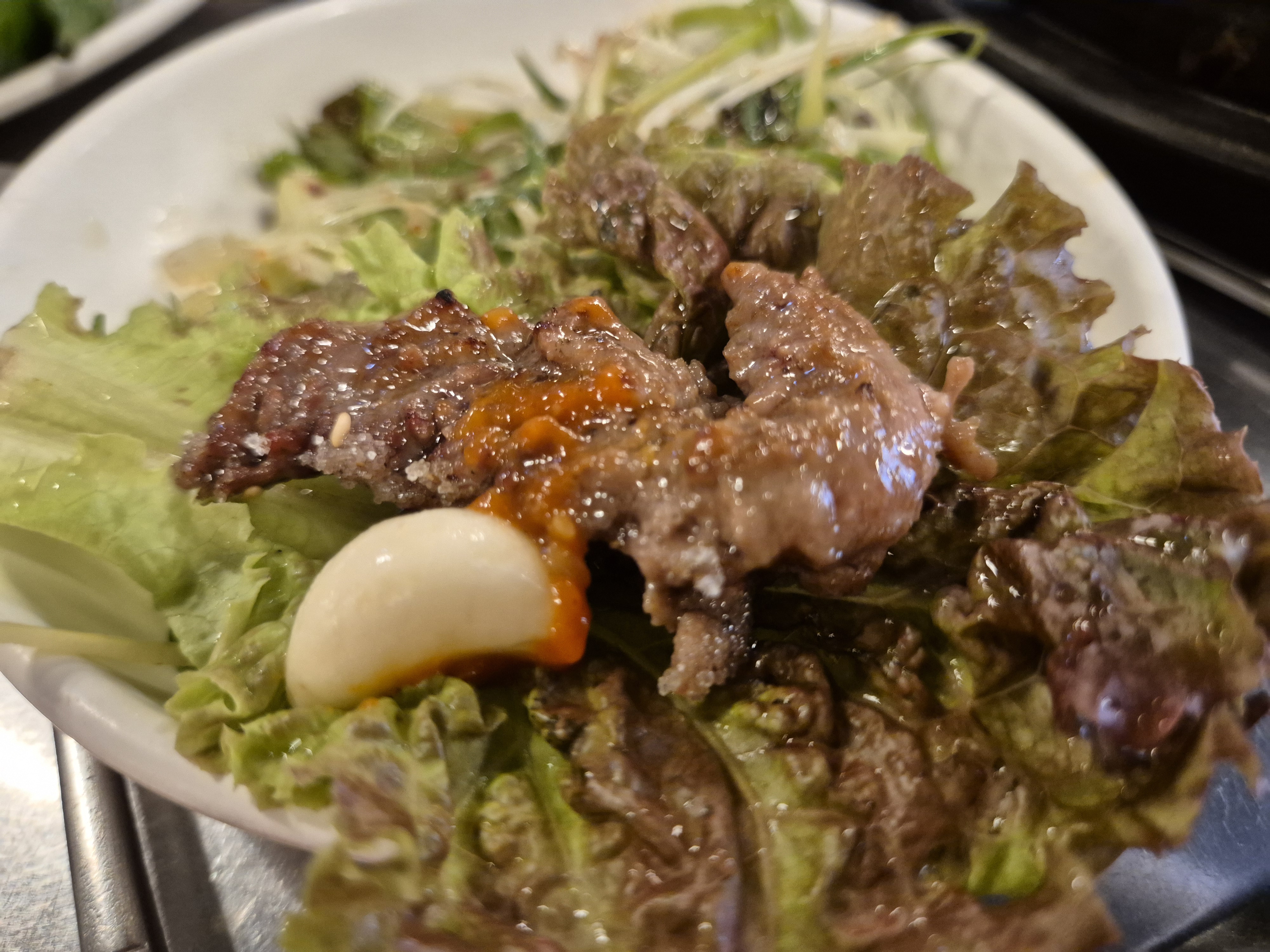 상추쌈에 마늘 얹어서
