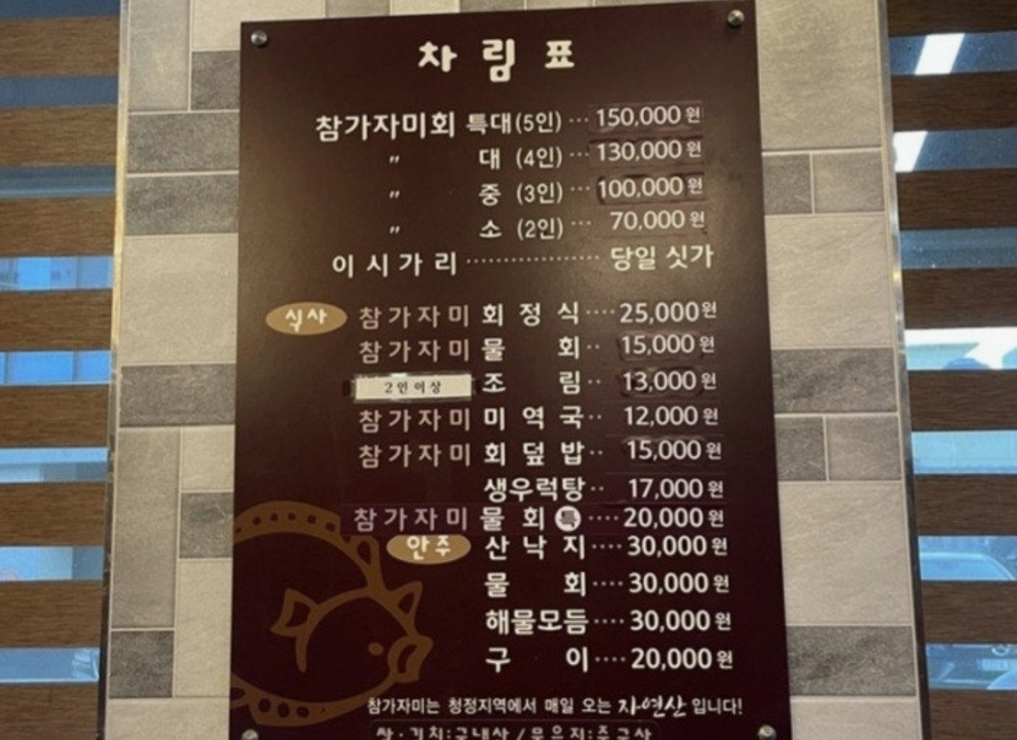 저희는 생우럭탕 20,000원과 참가자미구이 20,000원을 주문했습니다. 메뉴판에는 생우럭탕 가격이 인상 전으로 표시되어 있습니다. 참고하세요.