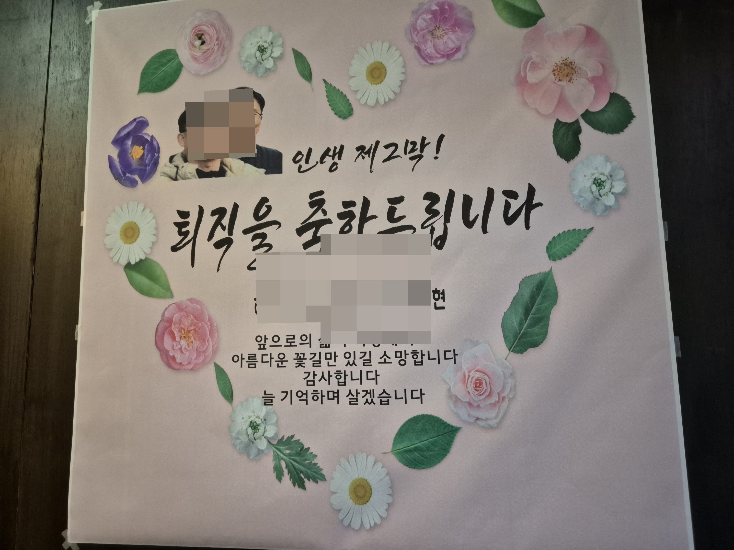 이번에는 후배 두 명이 명예퇴직을 하게 되어 그동안의 노고에 대한 감사와 제2의 인생을 응원하는 자리를 마련했습니다.